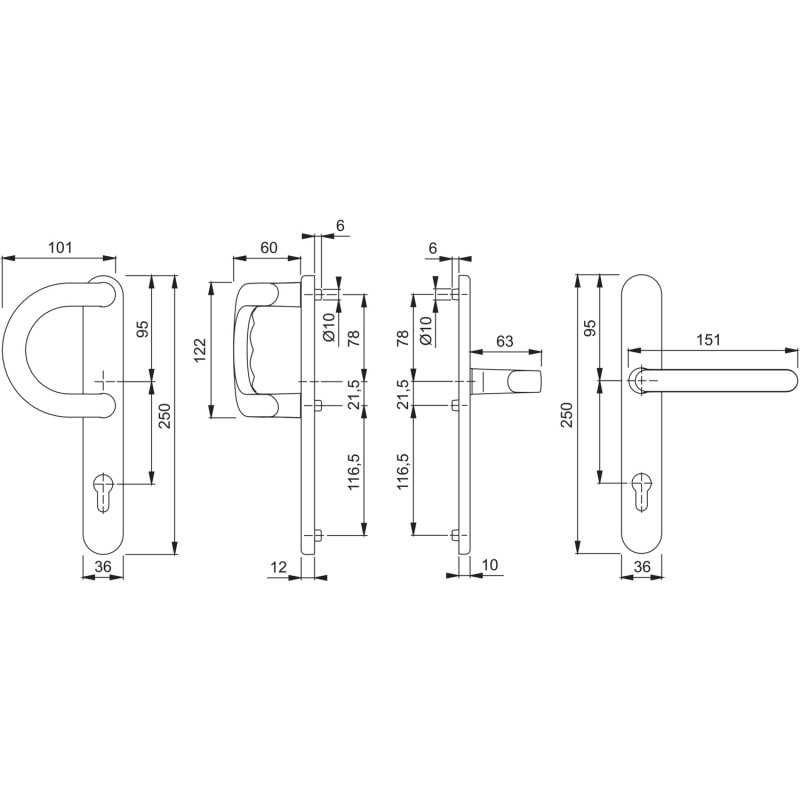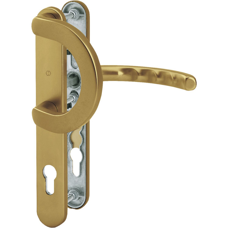 Elegantná súprava dverového kovania s oblúkovým madlom a dlhým štítkom, vhodná pre interiérové aj exteriérové dvere s hrúbkou 67–72 mm. Bronzový eloxovaný povrch dodáva moderný vzhľad a dlhodobú odolnosť.