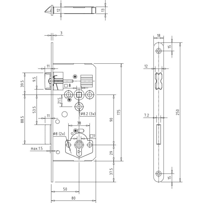rozteč: 90 mm, DM: 50 mm, štvorhran: 8 mm, telo zámku: 175 x 80 x 12 mm, štulp: 250 x 18 x 3 mm, strelka z plastu, závora z ocele, jednozápadový